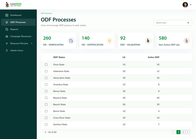 To support the goal of eradicating open defecation by 2025, I developed a web-based admin portal for the campaign. The platform transforms raw data into user-friendly, visual dashboards, enabling administrators to monitor ODF metrics and progress throughout Nigeria. With interactive data visualizations and customized reports, the portal simplifies the presentation of sanitation statistics, providing real-time insights to enhance accountability and engagement. This tool ensures ongoing monitoring of efforts, empowering local leaders to take effective action as necessary to keep the mission on course.